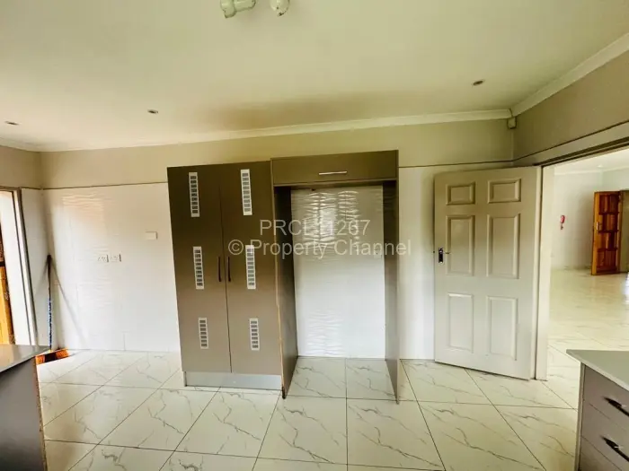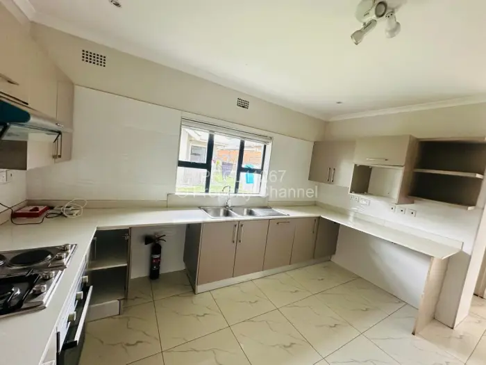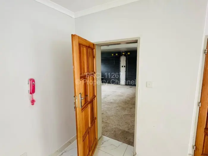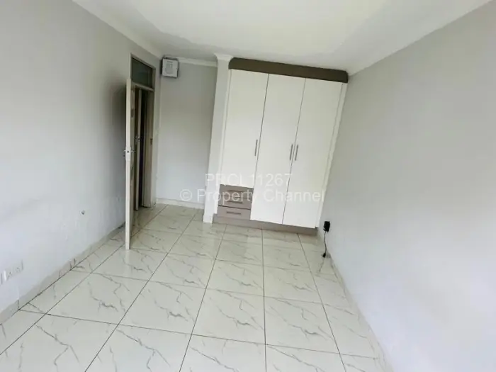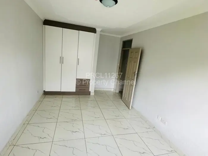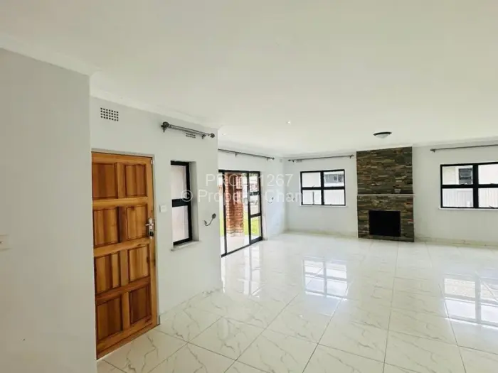 Discover modern living at this captivating 3-bedroom townhouse in Newlands, Harare. The exterior is striking, featuring a mix of textured brick and smooth plaster, framed by an inviting lawn that leads to a sturdy wooden entrance door.